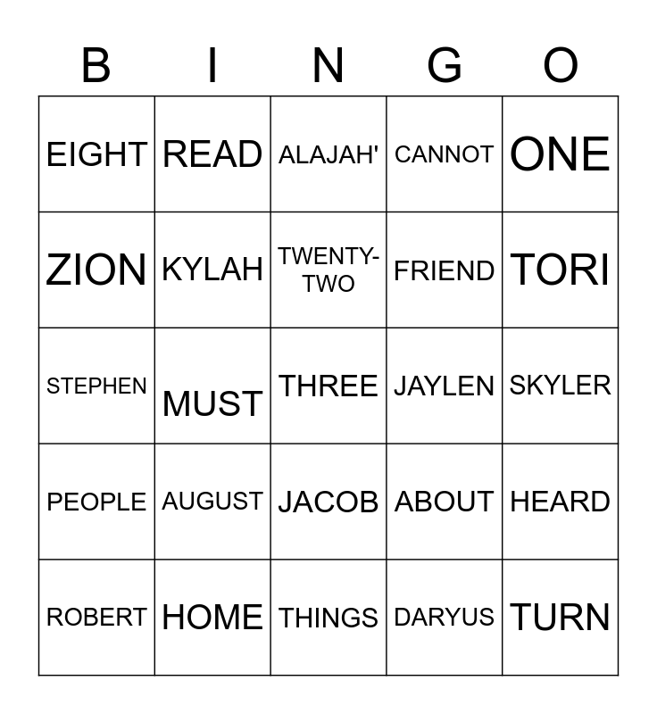 This bingo card has a free space and 24 words: AUGUST, HOME, TWENTY-TWO, ROBERT, ONE, EIGHT, ZION, READ, JAYLEN, JACOB, FRIEND, STEPHEN, ABOUT, HEARD, KYLAH, DARYUS, SKYLER, ALAJAH', TORI, MUST, TURN, PEOPLE, CANNOT and THINGS.