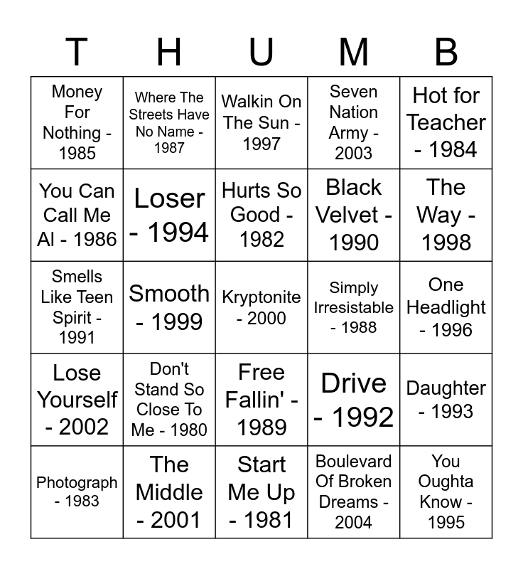 This bingo card has 25 words: Don't Stand So Close To Me - 1980, Start Me Up - 1981, Hurts So Good - 1982, Photograph - 1983, Hot for Teacher - 1984, Money For Nothing - 1985, You Can Call Me Al - 1986, Where The Streets Have No Name - 1987, Simply Irresistable - 1988, Free Fallin' - 1989, Black Velvet - 1990, Smells Like Teen Spirit - 1991, Drive - 1992, Daughter - 1993, Loser - 1994, You Oughta Know - 1995, One Headlight - 1996, Walkin On The Sun - 1997, The Way - 1998, Smooth - 1999, Kryptonite - 2000, The Middle - 2001, Lose Yourself - 2002, Seven Nation Army - 2003 and Boulevard Of Broken Dreams - 2004.