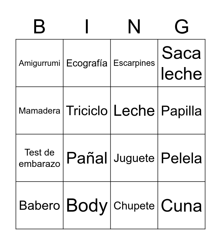 This bingo card has 23 words: Cuna, Coche, Papilla, Talco, Mamadera, Amigurrumi, Triciclo, Ecografía, Babero, Cigueña, Pañal, Test de embarazo, Silla para comer, Andador, Body, Termómetro, Escarpines, Juguete, Leche, Pelela, Saca leche, Chupete and Shampoo.