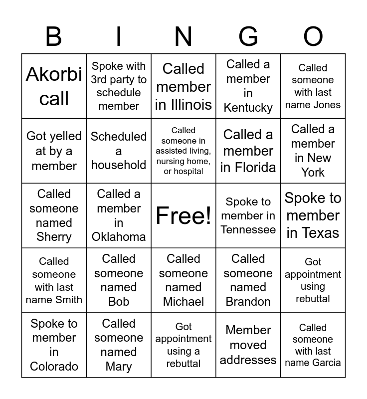 This bingo card has a free space and 24 words: Spoke to member in Colorado, Called someone named Bob, Called someone in assisted living, nursing home, or hospital, Member moved addresses, Called someone with last name Jones, Akorbi call, Spoke with 3rd party to schedule member, Called member in Illinois, Spoke to member in Tennessee, Spoke to member in Texas, Called someone named Sherry, Scheduled a household, Called someone named Brandon, Got appointment using rebuttal, Got yelled at by a member, Called someone named Mary, Got appointment using a rebuttal, Called a member in Kentucky, Called a member in New York, Called someone with last name Smith, Called a member in Oklahoma, Called someone named Michael, Called a member in Florida and Called someone with last name Garcia.