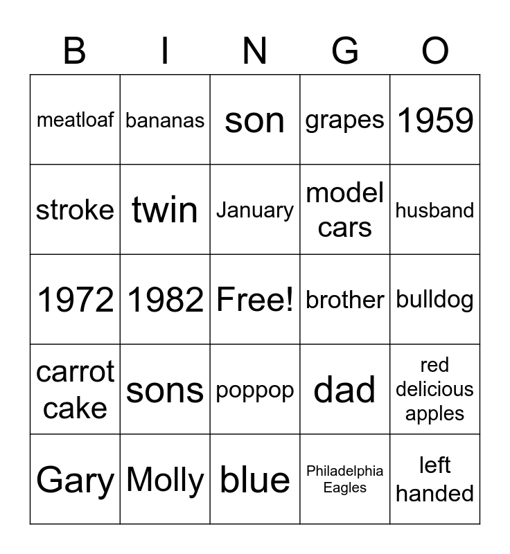 This bingo card has a free space and 29 words: Gary, dance, 1982, Ashbrook, meatloaf, son, twin, sons, brother, Molly, bulldog, left handed, blue, Philadelphia Eagles, husband, grandkids, poppop, carrot cake, 1959, 1972, dad, bulldog, model cars, stroke, grapes, bananas, red delicious apples, January and 2022.