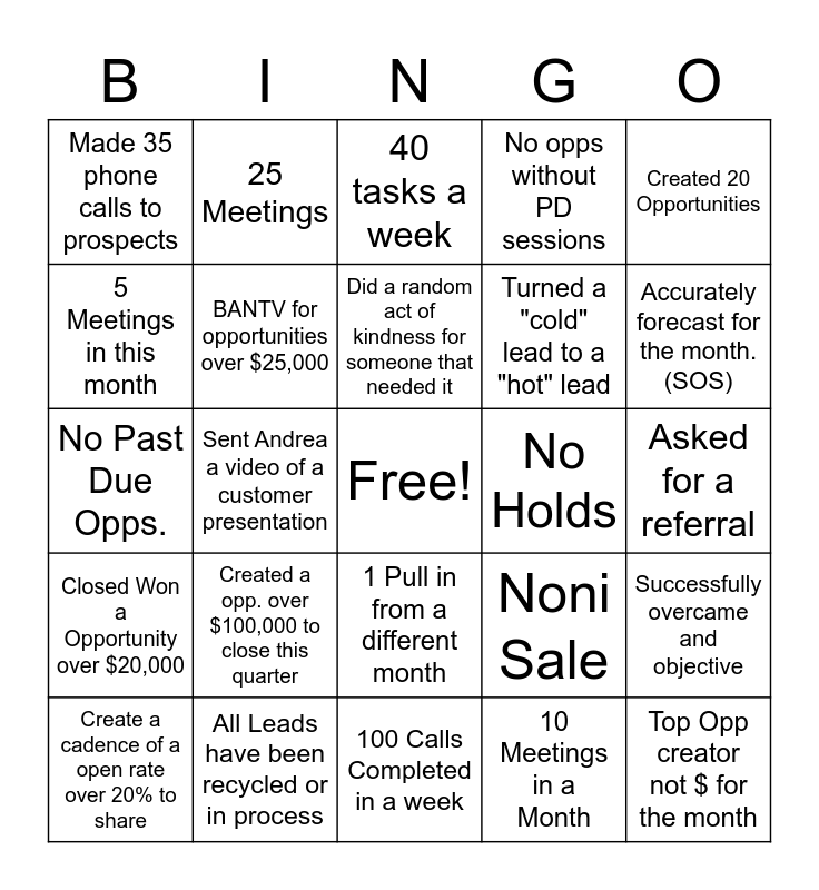 This bingo card has a free space and 24 words: Created a opp. over $100,000 to close this quarter, All Leads have been recycled or in process, Did a random act of kindness for someone that needed it, Create a cadence of a open rate over 20% to share, Created 20 Opportunities, Made 35 phone calls to prospects, 5 Meetings in this month, 25 Meetings, No Holds, 1 Pull in from a different month, Turned a "cold" lead to a "hot" lead, No Past Due Opps., Noni Sale, Successfully overcame and objective, BANTV for opportunities over $25,000, 10 Meetings in a Month, Asked for a referral, 40 tasks a week, Accurately forecast for the month. (SOS), Sent Andrea a video of a customer presentation, Top Opp creator not $ for the month, Closed Won a Opportunity over $20,000, No opps without PD sessions and 100 Calls Completed in a week.