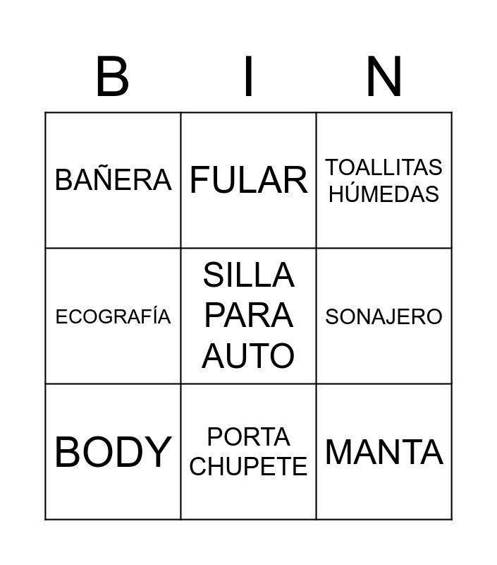 This bingo card has a free space and 14 words: MAMADERA, CUNA, BODY, FULAR, ECOGRAFÍA, MANTA, JUGUETE DE ENCASTRE, BEBÉ, PORTA CHUPETE, BAÑERA, LECHE, SONAJERO, TOALLITAS HÚMEDAS and CAMBIADOR.