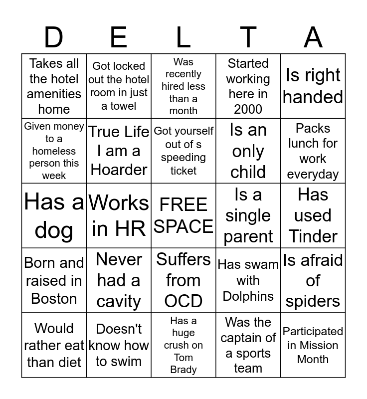 This bingo card has a free space and 24 words: Never had a cavity, Doesn't know how to swim, Got yourself out of s speeding ticket, Would rather eat than diet, Is right handed, Takes all the hotel amenities home, Given money to a homeless person this week, Got locked out the hotel room in just a towel, Is a single parent, Suffers from OCD, Is an only child, Has a dog, Has swam with Dolphins, Is afraid of spiders, True Life I am a Hoarder, Was the captain of a sports team, Has used Tinder, Was recently hired less than a month, Packs lunch for work everyday, Works in HR, Participated in Mission Month, Born and raised in Boston, Started working here in 2000 and Has a huge crush on Tom Brady.