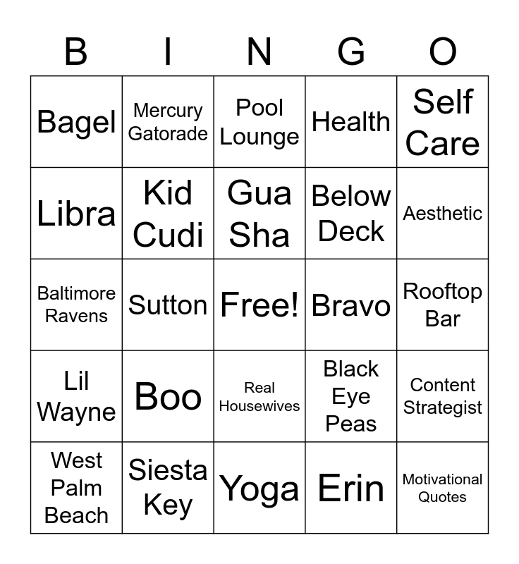 This bingo card has a free space and 25 words: Boo, Yoga, Gua Sha, West Palm Beach, Self Care, Bagel, Libra, Mercury Gatorade, Bravo, Real Housewives, Below Deck, Baltimore Ravens, Black Eye Peas, Content Strategist, Kid Cudi, Chipotle, Rooftop Bar, Pool Lounge, Aesthetic, Sutton, Motivational Quotes, Siesta Key, Lil Wayne, Health and Erin.