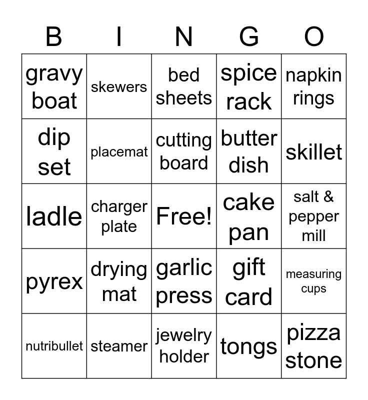 This bingo card has a free space and 65 words: banana hanger, prep cup, corn holders, measuring cups, spoon rest, potato macher, skewers, scissors, cutting board, trivet, garlic press, colander, salt & pepper mill, napkin rings, charcuterie board, dip set, charger plate, gravy boat, cake stand, butter dish, drying mat, pyrex, spice rack, ramekin set, baking sheet, moscow mule mugs, citrus juicer, drink dispenser, pizza stone, pots and pans, nutribullet, nespresso, knife set, carving set, gift card, steamer, dishes, ladle, tongs, flatware set, placemat, ice cream scoop, cake pan, baking dish, glass pitcher, paper towel holder, skillet, roaste, slippers, robe, coffee mugs, wine glasses, champagne glasses, jewelry holder, luggage set, blanket, picture frames, bed sheets, tote bag, toaster, ring dish, cookbook, candle, coasters and wine rack.