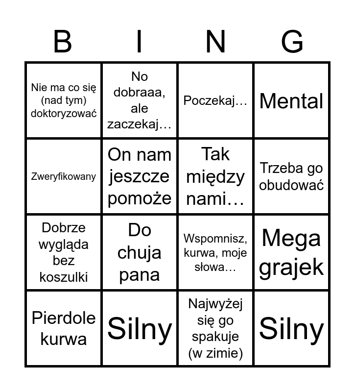 This bingo card has 18 words: Do chuja pana, Silny, Poczekaj…, Nie ma co się (nad tym) doktoryzować, Wspomnisz, kurwa, moje słowa…, Mental, Pierdole kurwa, No dobraaa, ale zaczekaj…, Trzeba go obudować, Dobrze wygląda bez koszulki, Najwyżej się go spakuje (w zimie), Zweryfikowany, Mega grajek, On nam jeszcze pomoże, Tak między nami…, Drużyna jest za nim, Silny and Mental.