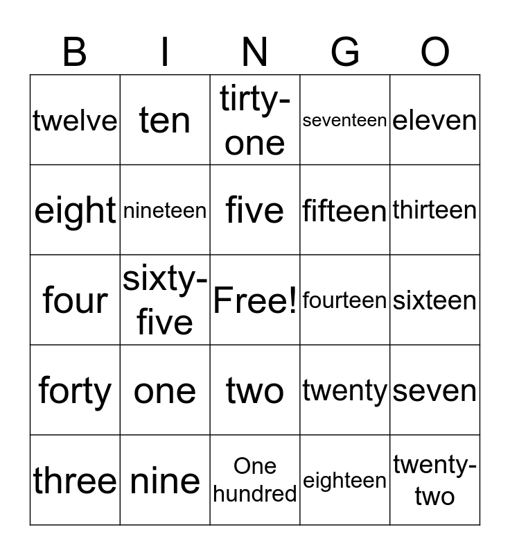 This bingo card has a free space and 24 words: one, nine, five, three, eleven, twelve, eight, ten, fourteen, two, fifteen, four, twenty, seven, nineteen, eighteen, sixteen, tirty-one, thirteen, sixty-five, twenty-two, forty, seventeen and One hundred.