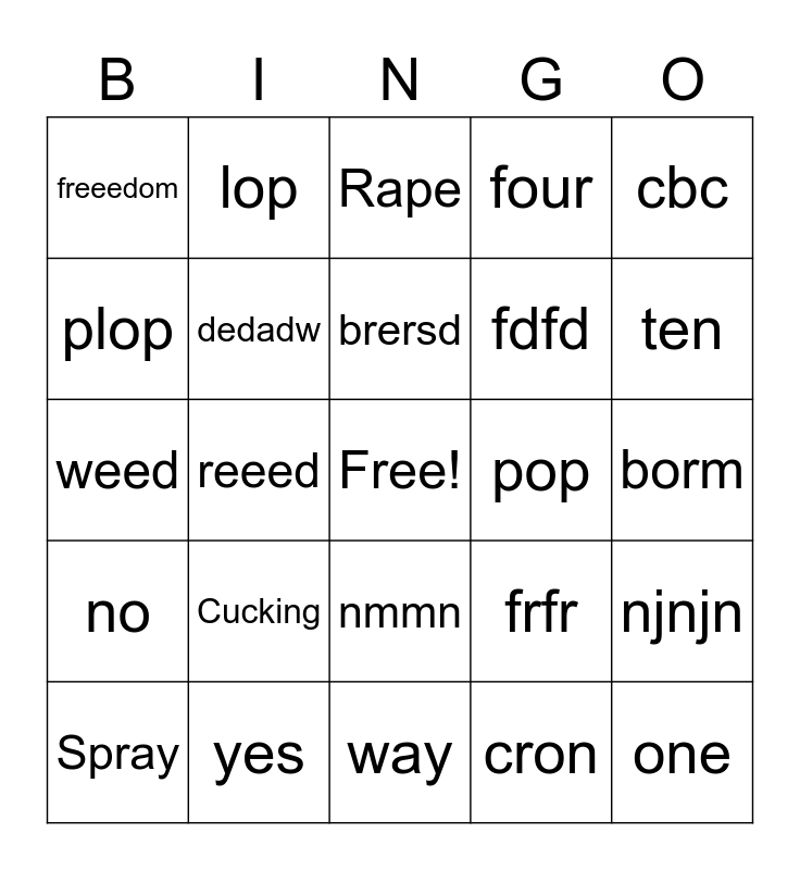 This bingo card has a free space and 24 words: Cucking, yes, brersd, Spray, cbc, freeedom, plop, lop, pop, nmmn, fdfd, weed, frfr, njnjn, dedadw, cron, borm, Rape, ten, reeed, one, no, four and way.