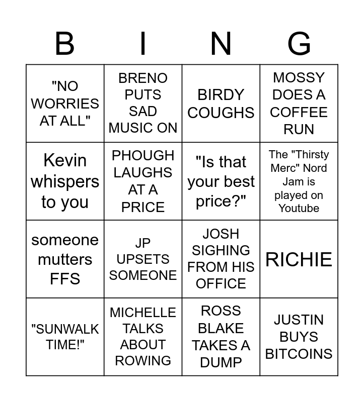 This bingo card has 16 words: MICHELLE TALKS ABOUT ROWING, RICHIE, BIRDY COUGHS, "NO WORRIES AT ALL", someone mutters FFS, BRENO PUTS SAD MUSIC ON, JOSH SIGHING FROM HIS OFFICE, ROSS BLAKE TAKES A DUMP, Kevin whispers to you, PHOUGH LAUGHS AT A PRICE, "SUNWALK TIME!", MOSSY DOES A COFFEE RUN, JP UPSETS SOMEONE, The "Thirsty Merc" Nord Jam is played on Youtube, "Is that your best price?" and JUSTIN BUYS BITCOINS.