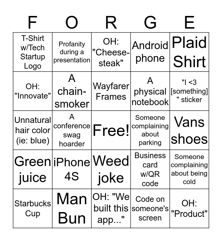 This bingo card has a free space and 24 words: iPhone 4S, Man Bun, Wayfarer Frames, Starbucks Cup, Plaid Shirt, T-Shirt w/Tech Startup Logo, OH: "Innovate", Profanity during a presentation, Someone complaining about parking, Weed joke, A physical notebook, Unnatural hair color (ie: blue), Business card w/QR code, Someone complaining about being cold, A chain-smoker, Code on someone's screen, Vans shoes, OH: "Cheese-steak", "I <3 [something] " sticker, A conference swag hoarder, OH: "Product", Green juice, Android phone and OH: "We built this app...".