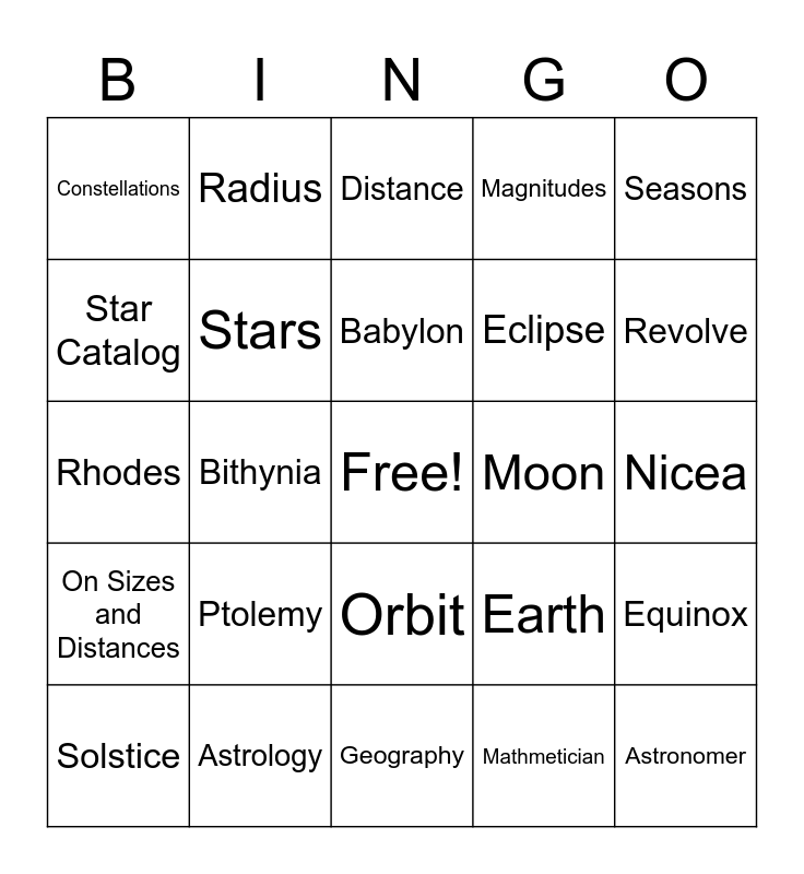This bingo card has a free space and 30 words: Astrology, Solar Theory, Bithynia, Weather calendar, Constellations, Distance, Stars, Orbit, Moon, Geography, Nicea, Astronomer, Mathmetician, Trigonometry, Revolve, Sun, Earth, On Sizes and Distances, Ptolemy, Seasons, Rhodes, Egypt, Radius, Eclipse, Star Catalog, Magnitudes, Equinox, Solstice, Babylon and Planets.