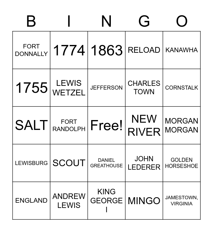 This bingo card has a free space and 24 words: SCOUT, ANDREW LEWIS, JEFFERSON, ENGLAND, KANAWHA, FORT DONNALLY, 1755, 1774, NEW RIVER, DANIEL GREATHOUSE, CHARLES TOWN, SALT, JOHN LEDERER, GOLDEN HORSESHOE, LEWIS WETZEL, MINGO, MORGAN MORGAN, 1863, CORNSTALK, FORT RANDOLPH, JAMESTOWN, VIRGINIA, LEWISBURG, RELOAD and KING GEORGE I.