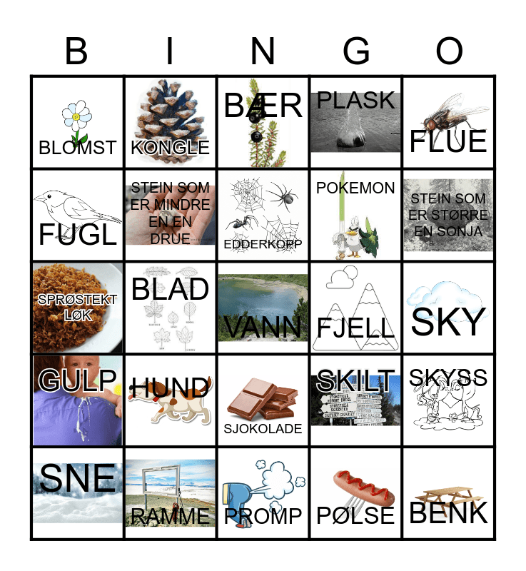This bingo card has 25 images and 25 words: HUND, PROMP, EDDERKOPP, SNE, FLUE, BLOMST, FUGL, KONGLE, FJELL, SJOKOLADE, POKEMON, SPRØSTEKT LØK, SKILT, SKYSS, STEIN SOM ER MINDRE EN EN DRUE, BENK, SKY, BÆR, STEIN SOM ER STØRRE EN SONJA, BLAD, VANN, RAMME, GULP, PLASK and PØLSE.