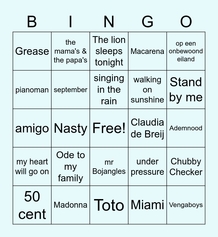 This bingo card has a free space and 48 words: Tarzan, Vengaboys, Lou Bega, Toto, Ode to my family, Griddy nutcracker, the mama's & the papa's, Lionel Richie, pianoman, The Rose, september, Macarena, Chubby Checker, under pressure, blof, Can can, singing in the rain, Claudia de Breij, Prince, op een onbewoond eiland, Nasty, Miami, Grease, walking on sunshine, Paffendorf, Stand by me, 50 cent, Door de wind, mr Bojangles, my heart will go on, René van Kooten, Bella Ciao, Somewhere only we know, Whitney Houston, Madonna, YMCA, Michael Jackson, Ademnood, Celebration, Happy birthday, Snollebollekes, Let it be, The lion sleeps tonight, 9 to 5, amigo, waka waka, Bruno Mars and Living Doll.