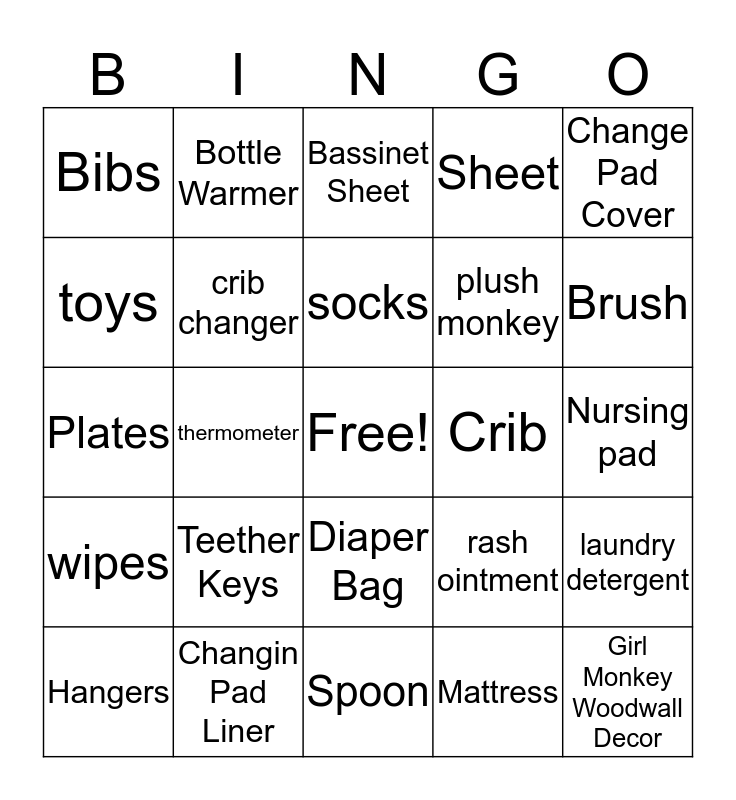 This bingo card has a free space and 44 words: Alphabet Wall Art, Girl Monkey Woodwall Decor, Diaper Stacker, Hangers, Hamper, Mattress, Bassinet Sheet, Blanket, Change Pad Cover, Changin Pad Liner, Sheet, Crib, Diaper Bag, Teether Keys, Cup, Spoon, Fork, Plates, Bowls, Brush, Bottle Warmer, Baby Food, Pacifier, Bibs, Bottle, Nursing pad, Breast pump, diapers, rash ointment, wipes, baby powder, laundry detergent, air purifier, humidifer, thermometer, lotion, baby wash, towel, socks, toys, plush monkey, chair, crib changer and mittens.
