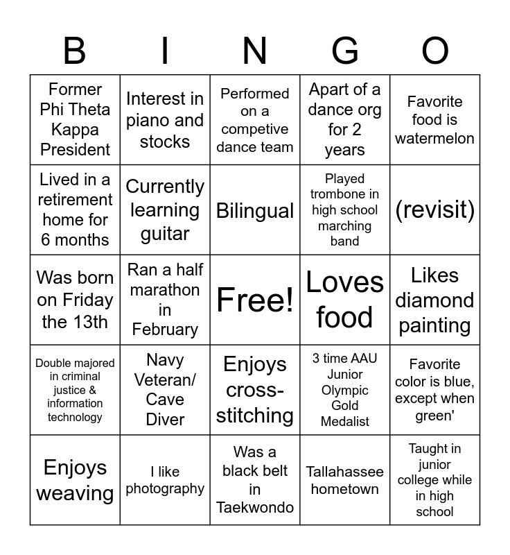 This bingo card has a free space and 47 words: Fun Fact, Taught in junior college while in high school, I'm a magician, Was a black belt in Taekwondo, Navy Veteran/ Cave Diver, Left handed, Interest in piano and stocks, Crochet, Lived in a retirement home for 6 months, Enjoys metal music, Currently learning guitar, Apart of a dance org for 2 years, Favorite color is blue, except when green', 3 time AAU Junior Olympic Gold Medalist, Worked as a costume character at Sea World, Plays cello, Bilingual, Loves food, Addicted to coffee, Favorite food is watermelon, Ran a half marathon in February, Tallahassee hometown, Former Phi Theta Kappa President, Played trombone in high school marching band, Has 2 dogs and a horse, (revisit), Enjoys weaving, Born in Savannah, Enjoys cross-stitching, Double majored in criminal justice & information technology, Has an uncle that is 14 years old, Competes in powerlifting, Born in Port-au-Prince, Haiti, Has 14 brothers and sisters, Was born on Thanksgiving, I like photography, Likes diamond painting, Played the violin for about ten years, Is a scubadriver, Studied abroad this summer, Make character art for D&D characters, Performed on a competive dance team, Was born on Friday the 13th, Is a twin, Fluent in ASL, Childhood dream job is a professional wrestler and Is a resin artist.