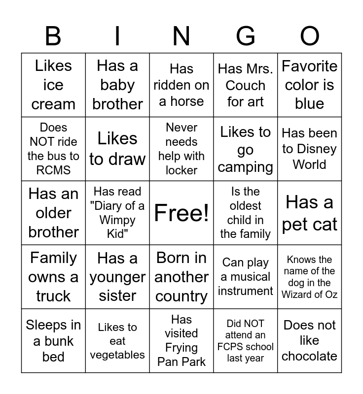 This bingo card has a free space and 30 words: Likes to eat vegetables, Has flown on an airplane, Has read "Diary of a Wimpy Kid", Has more than one pet, Likes ice cream, Has ridden on a horse, Likes to draw, Born in another country, Is the oldest child in the family, Has visited Frying Pan Park, Has a pet cat, Does not like chocolate, Did NOT attend an FCPS school last year, Favorite subject is Math, Has been to Disney World, Has lived in more than one state, Can play a musical instrument, Family owns a truck, Has a younger sister, Favorite color is blue, Has an older brother, Likes to skateboard, Has a baby brother, Likes to go camping, Does NOT ride the bus to RCMS, Has Mrs. Couch for art, Knows the name of the dog in the Wizard of Oz, Sleeps in a bunk bed, Never needs help with locker and Has seen the original Top Gun (not Maverick).