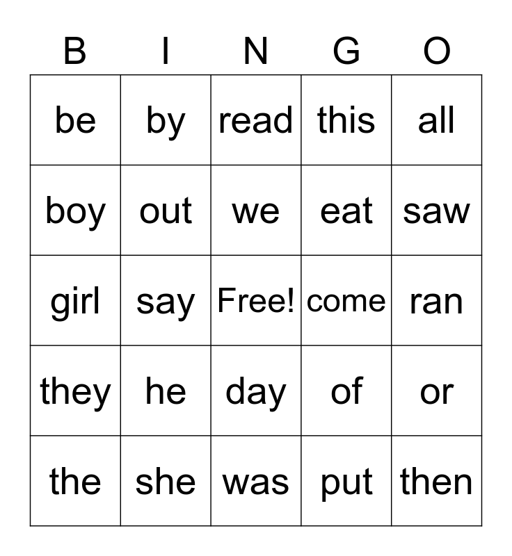 This bingo card has a free space and 24 words: he, she, we, the, all, be, boy, by, come, day, eat, girl, of, or, out, put, ran, read, saw, say, then, they, this and was.