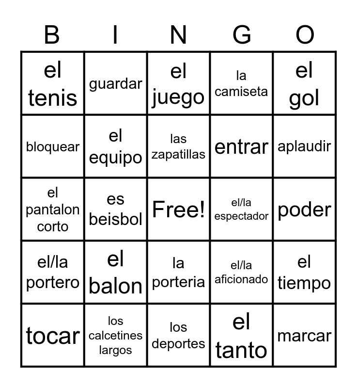 This bingo card has a free space and 31 words: los deportes, el futbol, es beisbol, el basquetbol, el tenis, el juego, el equipo, el/la aficionado, el/la espectador, el tanto, poder, marcar, perder, ganar, aplaudir, el campo de futbol, el tiempo, el balon, el/la portero, la porteria, el gol, lanzar, tocar, guardar, entrar, bloquear, la camiseta, el pantalon corto, los calcetines largos, las zapatillas and el color.