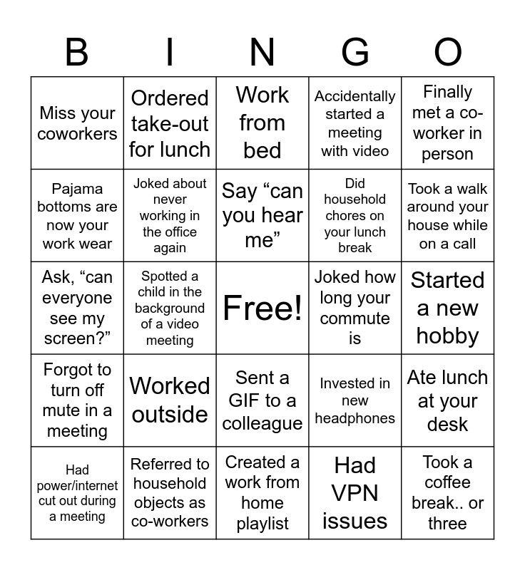 This bingo card has a free space and 35 words: Stretch, Say, “sorry I was on mute”, Have your meeting interrupted by family member/pet, Joked about never working in the office again, Sent a GIF to a colleague, Accidentally started a meeting with video, Pajama bottoms are now your work wear, Did some office chair yoga, Say “can you hear me”, Talked out loud to yourself, Ask, “can everyone see my screen?”, Finally met a co-worker in person, Used an emoji in an email, Say, “Sorry, I’m driving”, Miss your coworkers, Joked how long your commute is, Had VPN issues, Spotted a child in the background of a video meeting, Forgot to turn off mute in a meeting, Took a coffee break.. or three, Invested in new headphones, Had power/internet cut out during a meeting, Ate lunch at your desk, Referred to household objects as co-workers, Work from bed, Took a walk around your house while on a call, Free space, Made too many trips to the fridge, Did household chores on your lunch break, Started a new hobby, Say, “I hear an echo”, Created a work from home playlist, Worked outside, Ordered take-out for lunch and Created a makeshift standing desk.