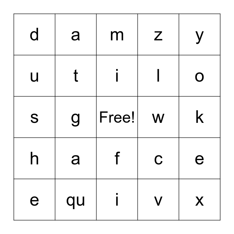 This bingo card has a free space and 29 words: e, b, g, j, d, m, t, a, w, qu, k, x, i, v, o, p, f, h, y, s, c, r, l, u, z, a, e, i and o.