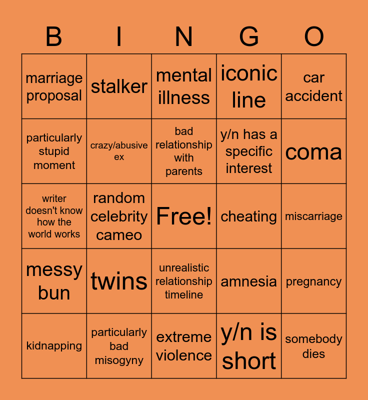 This bingo card has a free space and 24 words: kidnapping, twins, bad relationship with parents, y/n is short, car accident, marriage proposal, stalker, mental illness, cheating, miscarriage, writer doesn't know how the world works, crazy/abusive ex, amnesia, pregnancy, particularly stupid moment, particularly bad misogyny, extreme violence, iconic line, coma, messy bun, random celebrity cameo, unrealistic relationship timeline, y/n has a specific interest and somebody dies.