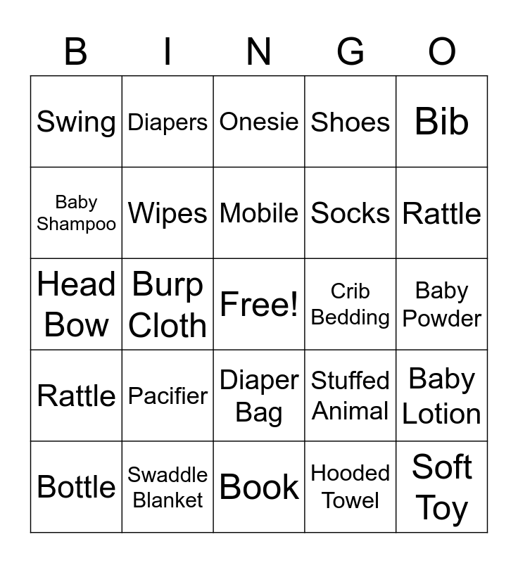 This bingo card has a free space and 24 words: Pacifier, Swaddle Blanket, Mobile, Bottle, Bib, Swing, Baby Shampoo, Diapers, Crib Bedding, Diaper Bag, Socks, Head Bow, Stuffed Animal, Baby Lotion, Wipes, Hooded Towel, Baby Powder, Onesie, Rattle, Burp Cloth, Soft Toy, Rattle, Shoes and Book.