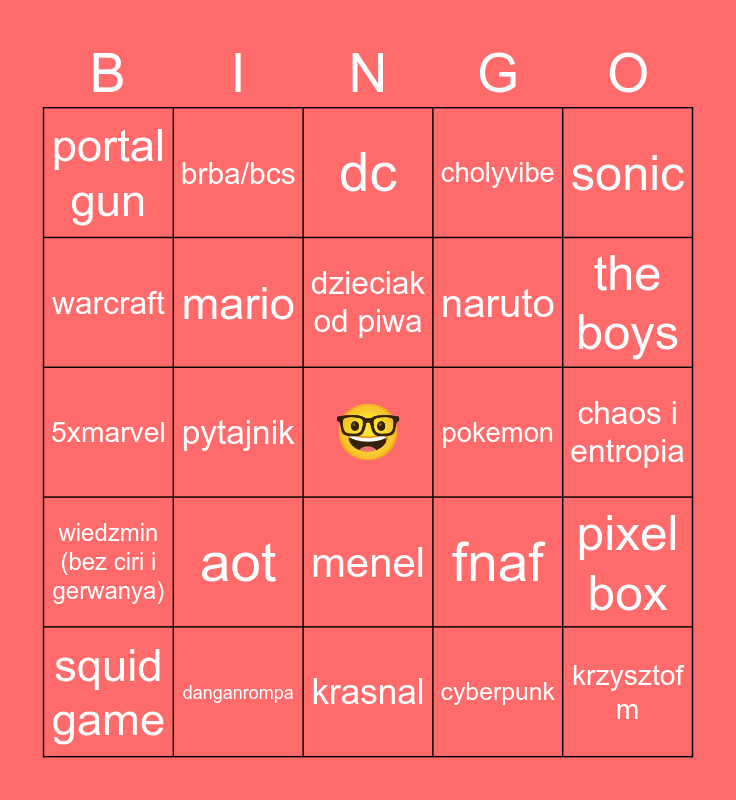 This bingo card has a free space and 24 words: aot, danganrompa, dzieciak od piwa, squid game, sonic, portal gun, warcraft, brba/bcs, pokemon, menel, naruto, 5xmarvel, fnaf, pixel box, mario, cyberpunk, chaos i entropia, dc, the boys, pytajnik, krzysztof m, wiedzmin (bez ciri i gerwanya), cholyvibe and krasnal.