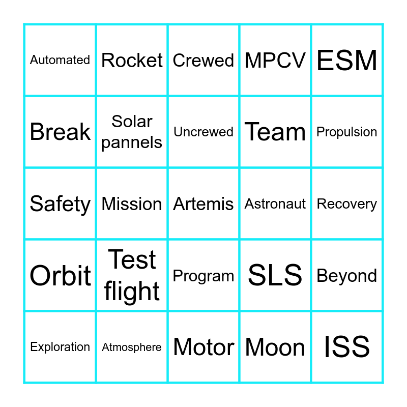 This bingo card has a free space and 33 words: Orion, ESA, Mission, Space, Orbit, Solar pannels, ESM, Exploration, Rocket, Lunar, Uncrewed, Crewed, Launch window, Spacecraft, Astronaut, Propulsion, Atmosphere, Safety, Test flight, SLS, Program, Payload, Automated, Recovery, Motor, ISS, MPCV, Team, Break, Beyond, Gravity, Moon and Mars.
