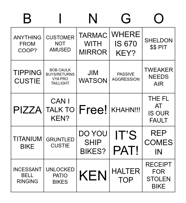 This bingo card has a free space and 69 words: BAKERY WINDFALL, THE FLAT IS OUR FAULT, JOE HEAD SIGHTING, MISSION CONTROL SUCCESS!, UNLOCKED PATIO BIKES, IRIE CUSTIE, WHERE IS 670 KEY?, FLOOR BIKE 2 SHOP, SHELDON $$ PIT, IRIE EMPLOYEE, REP COMES IN, TUBE KID/PATCH GUY, ANYTHING FROM COOP?, TARMAC WITH MIRROR, JAWS AKA HATCH BACK, CAN I TALK TO KEN?, DO YOU SHIP BIKES?, PASSIVE AGGRESSION, KILL DAT SALE, TITANIUM BIKE, KHAHN!!!, IT’S PAT!, TWEAKER NEEDS AIR, FULL ROADIE KIT, SCOOTER, SKI ANYTHING, TUBE EXPLOSION, EX EMPLOYEE, HALTER TOP, COOL ACCENT, CUSTOMER NOT AMUSED, ELLIPTIGO, ONLY ALLEN CAN FIX IT, REALLY COOL NON-OEM BIKE, DOG IN STORE, CARRY-A-FLAT, BIG PHONE SALE, RITCHIE ARMSTRONG, TIPPING CUSTIE, TWINS, GRUNTLED CUSTIE, RECEIPT FOR STOLEN BIKE, SALES PROFANITY, CHRIS KING, SHORT NOTICE RENTAL, INCESSANT BELL RINGING, FREEDOM 2 RIDE, DA BRIM, ITALY VISIT, BOB CAULK BUYS/RETURNS VYA PRO TAILLIGHT, JIM WATSON, ERF MISSING, BURNING MAN BIKE, KEN, INTERNET DOWN :(, FISHING 4 DISCOUNTS, LOVES THE MUSIC, 670 ALARM, RIDING IN STORE, PIZZA, GLASS PRESSER (HERE B4 OPEN), FREE KICKSTAND, WOW HE’S STILL TALKING, WO(MAN) IN UNIFORM, LOOKING FOR BIKE BOX, FORGOTTEN ID, BLACK WIDOW, !TANDEMONIUM! and E-BIKE TURNED AWAY.