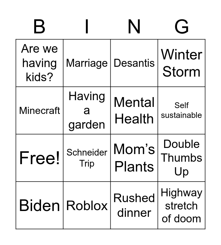 This bingo card has 20 words: Double Thumbs Up, “Crystal Shut up!”, Desantis, Trump, Biden, Minecraft, Roblox, Are we having kids?, Free!, Marriage, Schneider Trip, Mom’s Plants, Having a garden, Highway stretch of doom, Mental Health, People moving back to Cache, Self sustainable, Winter Storm, Rushed dinner and Covid.