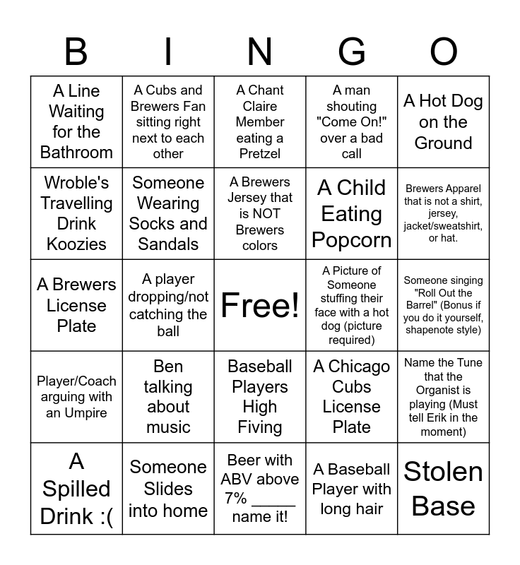 This bingo card has a free space and 25 words: Ben talking about music, Beer with ABV above 7% _____ name it!, A Brewers Jersey that is NOT Brewers colors, A Spilled Drink :(, A Hot Dog on the Ground, A Line Waiting for the Bathroom, Wroble's Travelling Drink Koozies, A Cubs and Brewers Fan sitting right next to each other, A Picture of Someone stuffing their face with a hot dog (picture required), Baseball Players High Fiving, A Child Eating Popcorn, A Brewers License Plate, A Chicago Cubs License Plate, Name the Tune that the Organist is playing (Must tell Erik in the moment), Someone Wearing Socks and Sandals, One of the Racing Sausages tripping, Someone singing "Roll Out the Barrel" (Bonus if you do it yourself, shapenote style), A Chant Claire Member eating a Pretzel, Brewers Apparel that is not a shirt, jersey, jacket/sweatshirt, or hat., A player dropping/not catching the ball, Stolen Base, Someone Slides into home, Player/Coach arguing with an Umpire, A man shouting "Come On!" over a bad call and A Baseball Player with long hair.