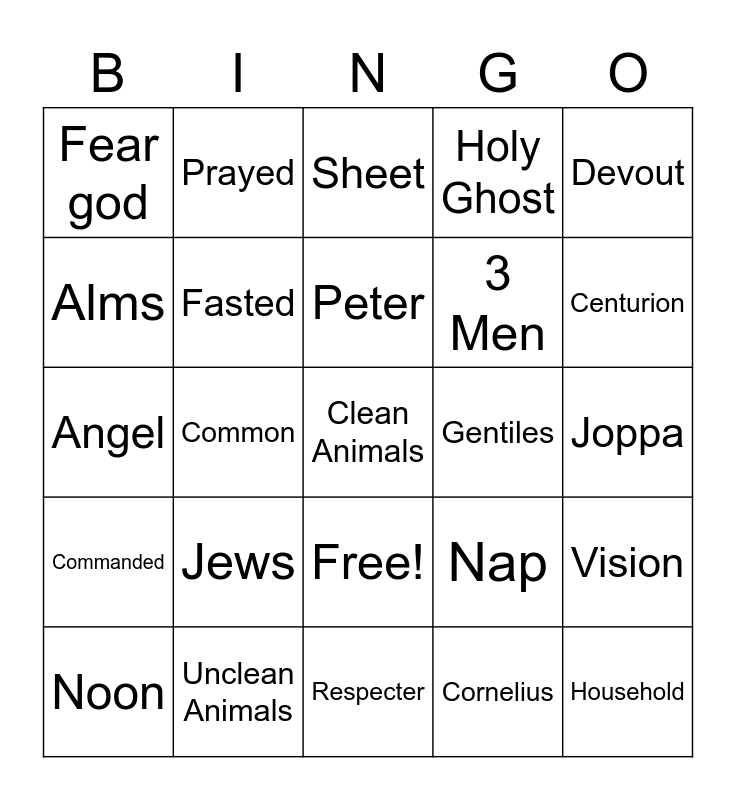 This bingo card has 26 words: Free!, Cornelius, Peter, Unclean Animals, Devout, Fear god, Alms, Prayed, Joppa, Nap, 3 Men, Angel, Vision, Noon, Common, Baptized, Holy Ghost, Commanded, Sheet, Clean Animals, Centurion, Respecter, Gentiles, Jews, Fasted and Household.