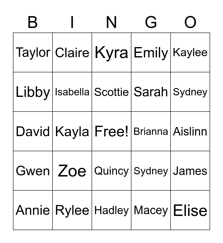 This bingo card has a free space and 36 words: Brooklee, Makayla, Nash, Isabella, Sydney, Gwen, Scottie, Ella, Kaylee, Kaylee, Kayla, Emily, Sky, Brianna, Sydney, Taylor, Drake, Zoe, Elise, Kyra, Aislinn, James, Rylee, Annie, Hadley, Claire, David, Ellyse, Sarah, Libby, Ashley, London, Macey, Quincy, Sadie and Grace.