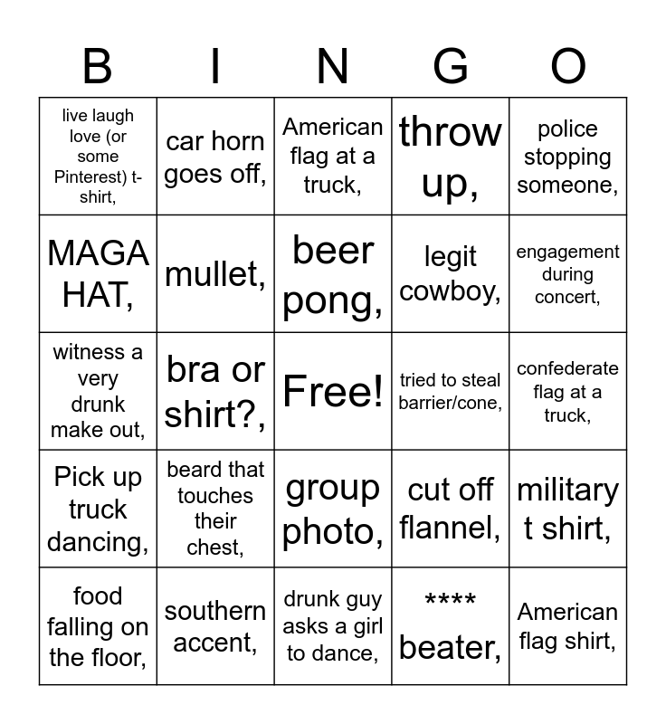 This bingo card has a free space and 36 words: Shirtless Men ew, Drunk 18 these old, beer bong,, mullet,, cut off flannel,, Pick up truck dancing,, beer pong,, adult woman hitting on underage boy,, police stopping someone,, back tattoo,, bra or shirt?,, throw up,, lost friend group,, tried to steal barrier/cone,, engagement during concert,, live laugh love (or some Pinterest) t-shirt,, all camo outfit,, beard that touches their chest,, American flag shirt,, American flag at a truck,, confederate flag at a truck,, military t shirt,, southern accent,, food falling on the floor,, drunk guy asks a girl to dance,, car horn goes off,, witness a very drunk make out,, overalls, all red white and blue outfit,, legit cowboy,, MAGA HAT,, doesn’t know any songs,, flip flops,, **** beater,, group photo,, car won’t start, and someone denied purchasing alc,.