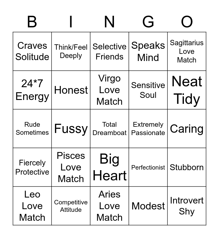 This bingo card has 25 words: Pisces Love Match, Aries Love Match, Virgo Love Match, Leo Love Match, Sagittarius Love Match, Craves Solitude, 24*7 Energy, Think/Feel Deeply, Extremely Passionate, Big Heart, Sensitive Soul, Rude Sometimes, Perfectionist, Stubborn, Honest, Introvert Shy, Caring, Selective Friends, Neat Tidy, Fussy, Total Dreamboat, Competitive Attitude, Fiercely Protective, Speaks Mind and Modest.