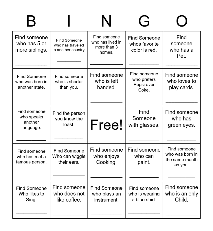 This bingo card has a free space and 25 words: Find Someone Who can wiggle their ears. ____________, Find Someone who plays an instrument. ___________, Find someone who is left handed. ___________, Find Someone Who likes to Sing. ____________, Find someone who has a Pet. ___________, Find someone who has 5 or more siblings. ___________, Find Someone who was born in another state. _____________, Find Someone who has traveled to another country. ___________, Find Someone with glasses. __________, Find someone who enjoys Cooking. ___________, Find someone who prefers Pepsi over Coke. ___________, Find someone who speaks another language. ____________, Find someone who can paint. __________, Find someone who was born in the same month as you. ___________, Find someone who is shorter than you. _____________, Find someone who has been on a cruise. ___________, Find someone who has green eyes. __________, Find someone who has lived in more than 3 homes. ______________, Find someone who loves to play cards. ___________, Find the person you know the least. ___________, Find someone who is an only Child. ___________, Find someone who does not like coffee. ___________, Find someone who has met a famous person. _____________, Find Someone whos favorite color is red. ___________ and Find someone who is wearing a blue shirt. ____________.