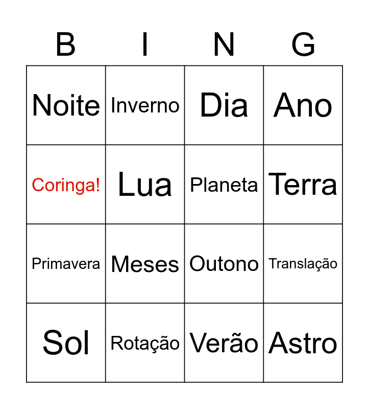 This bingo card has 16 words: Rotação, Translação, Dia, Noite, Primavera, Inverno, Outono, Verão, Coringa!, Lua, Sol, Ano, Meses, Terra, Planeta and Astro.