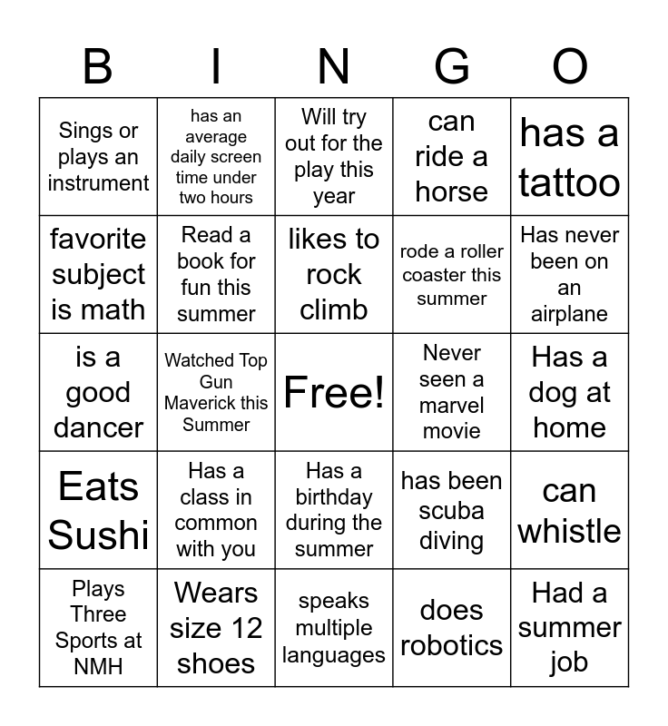 This bingo card has a free space and 29 words: Plays Three Sports at NMH, Has a Sibling that goes to NMH, Watched Top Gun Maverick this Summer, Saw Season 4 of Stranger Things, Sings or plays an instrument, Will try out for the play this year, Read a book for fun this summer, Has a class in common with you, Never seen a marvel movie, Wears size 12 shoes, Has a dog at home, Had a summer job, speaks multiple languages, does robotics, Has never been on an airplane, Has never broken a bone, Has a birthday during the summer, Eats Sushi, has a tattoo, is a good dancer, has been scuba diving, is afraid of spiders, rode a roller coaster this summer, favorite subject is math, can ride a horse, has an average daily screen time under two hours, can whistle, likes to rock climb and has run a marathon.