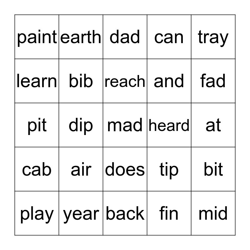 This bingo card has a free space and 24 words: air, year, reach, play, tray, paint, learn, earth, heard, does, and, pit, tip, bit, bib, fin, at, dad, fad, dip, mid, cab, can and back.