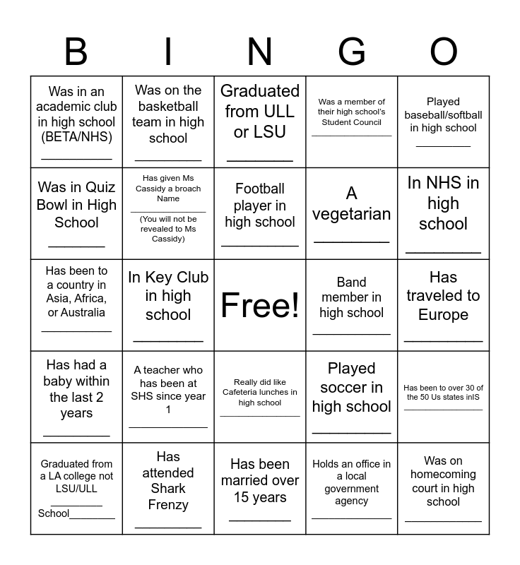 This bingo card has a free space and 29 words: Cheerleader in high school _________, Has attended Shark Frenzy _________, Graduated from ULL or LSU _______, Was valedictorian of high school class _________________, Played baseball/softball in high school _________, Was in an academic club in high school (BETA/NHS) __________, Has given Ms Cassidy a broach Name ________________ (You will not be revealed to Ms Cassidy), Football player in high school __________, Band member in high school ___________, Has been to over 30 of the 50 Us states inIS __________________, Graduated from a LA college not LSU/ULL _________ School________, In Key Club in high school ________, Holds an office in a local government agency ______________, Was on homecoming court in high school ____________, Has been to a country in Asia, Africa, or Australia ___________, Was in speech/debate/theatre in high school ________________, Has been married over 15 years ________, Played soccer in high school _________, In NHS in high school ________, Has had a baby within the last 2 years _________, A teacher who has been at SHS since year 1 _____________, Is a gardener _______, A vegetarian ________, Has traveled to Europe _________, Was in Quiz Bowl in High School _______, Was on the basketball team in high school _________, Really did like Cafeteria lunches in high school _________________, Was a member of their high school’s Student Council _________________ and Ran track/cross in high school ___________.
