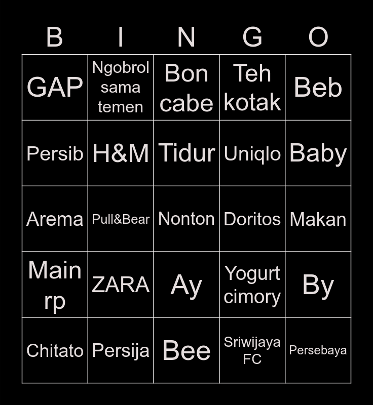This bingo card has a free space and 24 words: ZARA, Persija, Tidur, Chitato, Beb, GAP, Persib, Ngobrol sama temen, Doritos, Ay, Uniqlo, Arema, Yogurt cimory, By, H&M, Sriwijaya FC, Makan, Bon cabe, Baby, Pull&Bear, Persebaya, Main rp, Teh kotak and Bee.