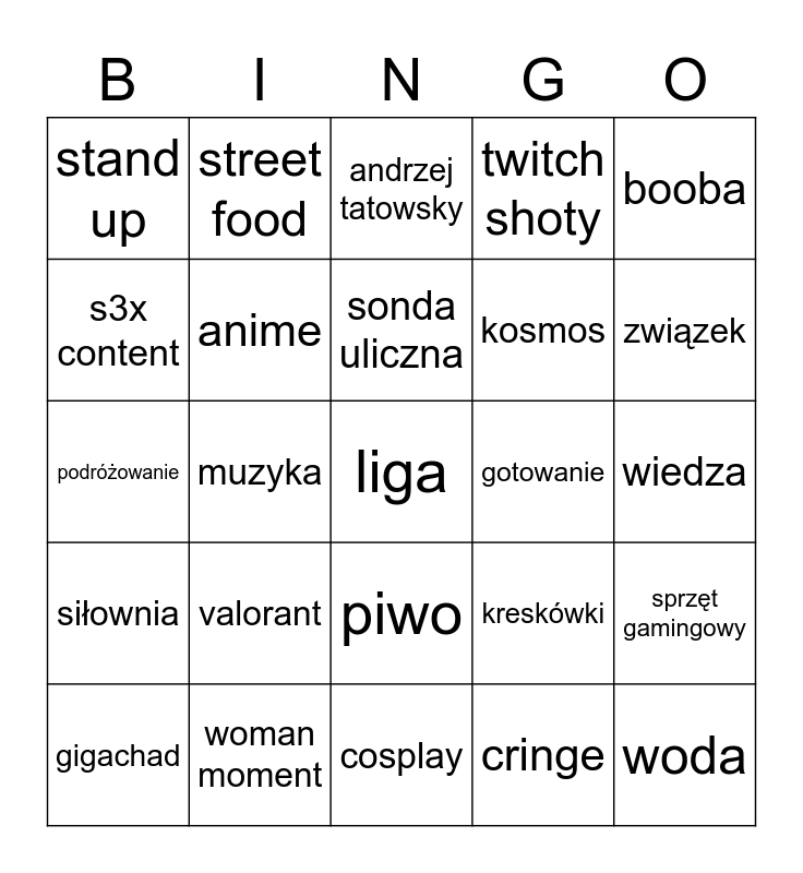 This bingo card has a free space and 24 words: valorant, woman moment, sonda uliczna, gigachad, booba, stand up, s3x content, street food, gotowanie, piwo, kosmos, podróżowanie, kreskówki, sprzęt gamingowy, anime, cringe, wiedza, andrzej tatowsky, związek, muzyka, woda, siłownia, twitch shoty and cosplay.
