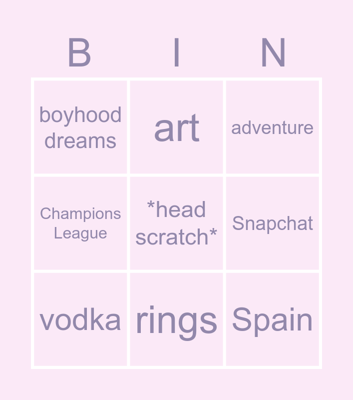 This bingo card has a free space and 32 words: #garths toughest challenge, Hulme, badminton, cross-fit, hockey, vodka, Spain, family, art, Peter Schmeichel, rings, adventure, bass, Sorrel, race, Saturday, United, Beckham, fitness, sport, oasis, leather, beer, pint, Fergie, Champions League, memory, Snapchat, boyhood dreams, Portugal, cricket and self belief.