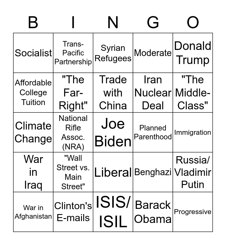 This bingo card has a free space and 24 words: "Wall Street vs. Main Street", Clinton's E-mails, Trade with China, War in Afghanistan, Donald Trump, Socialist, Affordable College Tuition, Trans- Pacific Partnership, Planned Parenthood, Liberal, Iran Nuclear Deal, Climate Change, Benghazi, Russia/ Vladimir Putin, "The Far-Right", Barack Obama, Immigration, Syrian Refugees, "The Middle- Class", National Rifle Assoc. (NRA), Progressive, War in Iraq, Moderate and ISIS/ ISIL.