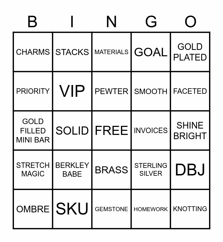 This bingo card has a free space and 24 words: BERKLEY BABE, SKU, PEWTER, OMBRE, GOLD PLATED, CHARMS, PRIORITY, STACKS, INVOICES, BRASS, SMOOTH, GOLD FILLED MINI BAR, STERLING SILVER, DBJ, VIP, HOMEWORK, SHINE BRIGHT, MATERIALS, FACETED, SOLID, KNOTTING, STRETCH MAGIC, GOAL and GEMSTONE.