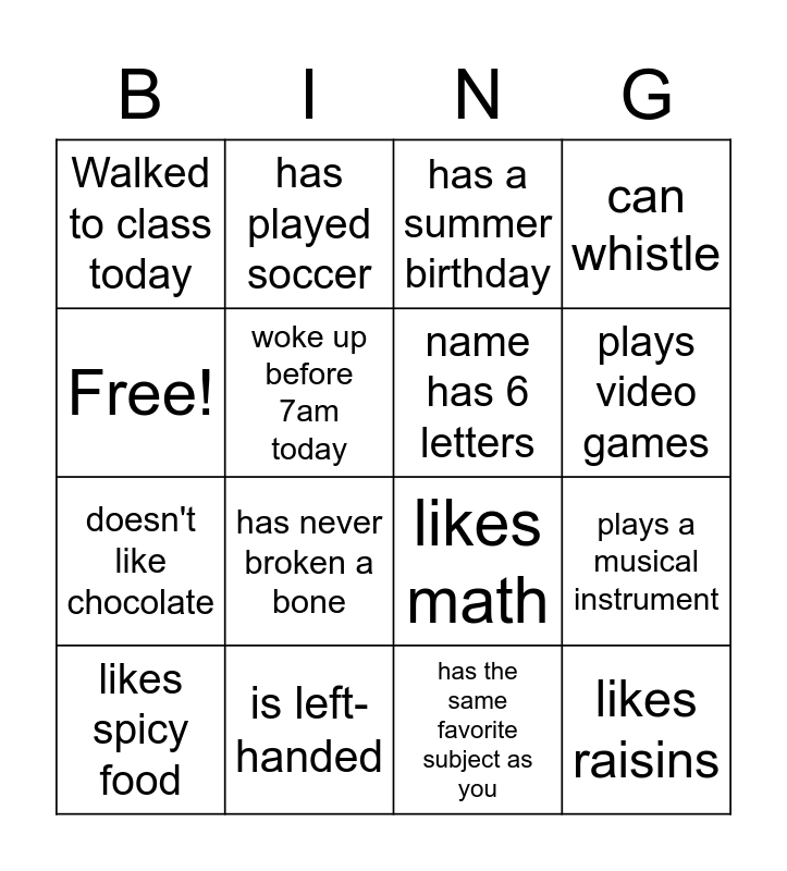 This bingo card has 16 words: is left-handed, plays a musical instrument, has a summer birthday, Walked to class today, doesn't like chocolate, has played soccer, likes math, has the same favorite subject as you, Free!, woke up before 7am today, likes spicy food, can whistle, has never broken a bone, plays video games, name has 6 letters and likes raisins.