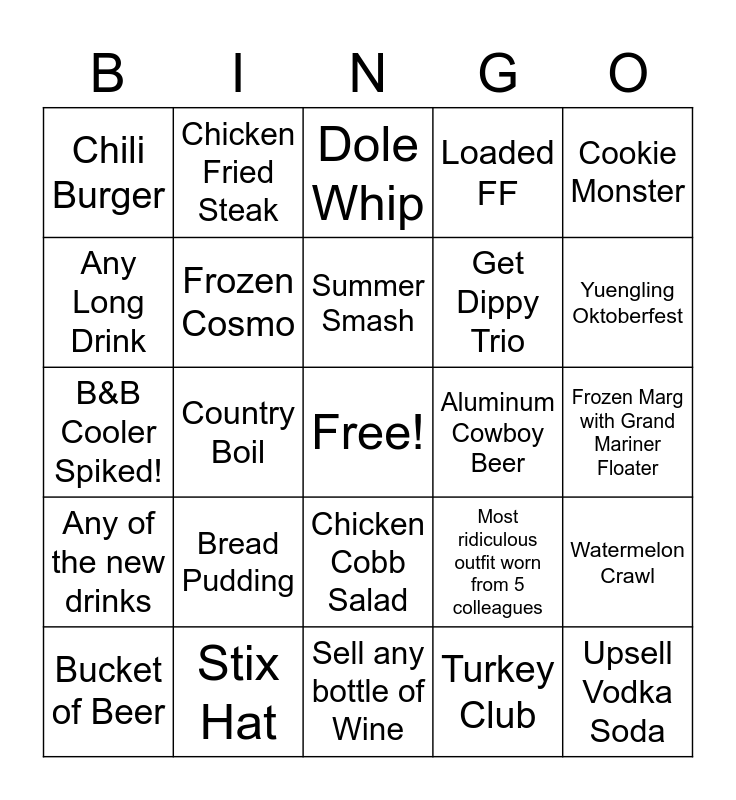 This bingo card has a free space and 28 words: Watermelon Crawl, Nachos, Get Dippy Trio, Turkey Club, Any Long Drink, Dole Whip, Chicken Fried Steak, Any of the new drinks, Aluminum Cowboy Beer, Bucket of Beer, B&B Cooler Spiked!, Loaded FF, Stix Hat, Sell any bottle of Wine, Yuengling Oktoberfest, Greet 5 guests at the door, Bread Pudding, Frozen Cosmo, Summer Smash, Chicken Cobb Salad, Chili Burger, Upsell Margarita on Rox, Upsell Vodka Soda, Country Boil, Frozen Marg with Grand Mariner Floater, Most ridiculous outfit worn from 5 colleagues, Cookie Monster and Chicken Fried Chicken.
