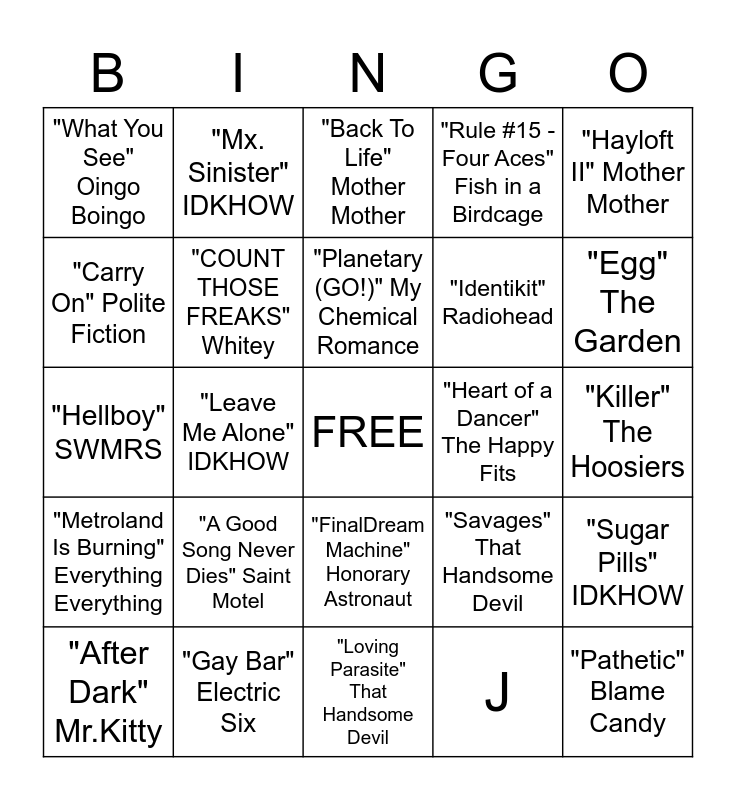 This bingo card has a free space and 25 words: "A Good Song Never Dies" Saint Motel, "Loving Parasite" That Handsome Devil, "Planetary (GO!)" My Chemical Romance, "After Dark" Mr.Kitty, "Hayloft II" Mother Mother, "What You See" Oingo Boingo, "Carry On" Polite Fiction, "Mx. Sinister" IDKHOW, "Heart of a Dancer" The Happy Fits, "FinalDream Machine" Honorary Astronaut, "Identikit" Radiohead, "Hellboy" SWMRS, "Savages" That Handsome Devil, "Sugar Pills" IDKHOW, "COUNT THOSE FREAKS" Whitey, "2econd 2ight 2eer" Will Wood, "Killer" The Hoosiers, "Back To Life" Mother Mother, "Egg" The Garden, "Leave Me Alone" IDKHOW, "Pathetic" Blame Candy, "Gay Bar" Electric Six, "Metroland Is Burning" Everything Everything, "Rule #15 - Four Aces" Fish in a Birdcage and J.
